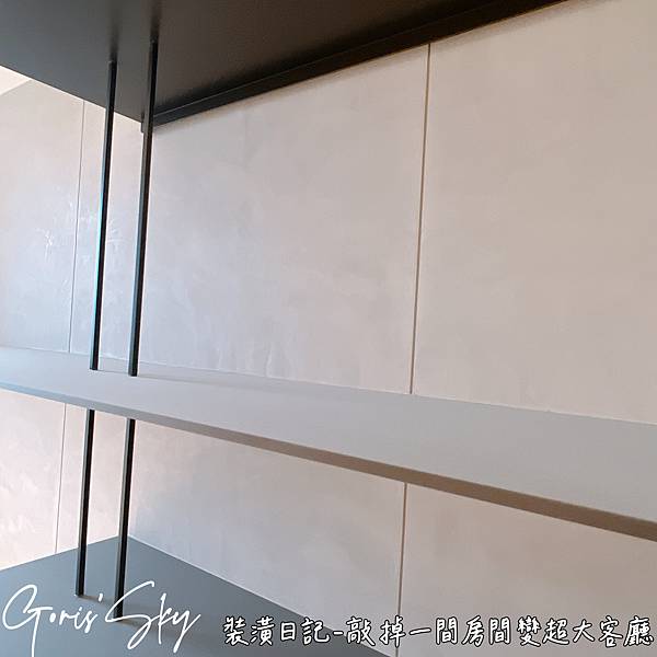 這是工作室後面的層板,還沒有拆模,做得比較簡約,然後用了不是很便宜的馬來漆,去投出視覺質感,加上盡量在可以看見的視覺上,不要做太多的設計,但其他你看不到的地方,其實都是收納,大概是一種裝潢最基本的概念。