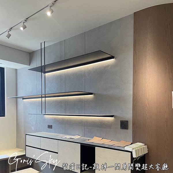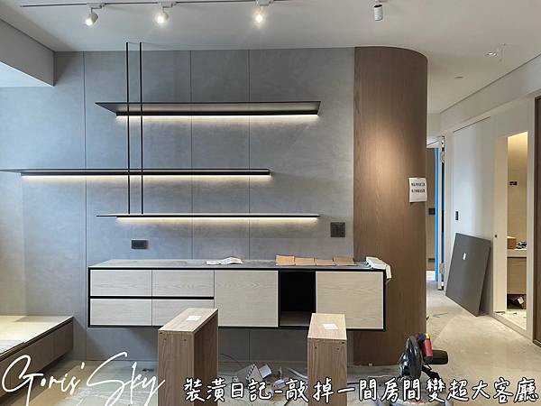 整格進度好快啊趁做地板前來一張!!!整個裝潢過程我最喜歡的一個決定!我越寫越喜歡,因為真的從裝潢小白到現在一路真的有夠多心得想分享!!!!本來還是整個工地照,現在大客廳整個概念雛形加上試了一下燈整體感覺很舒服很喜歡,在地板還沒鋪之前,剛好可以做一個頓點紀錄!