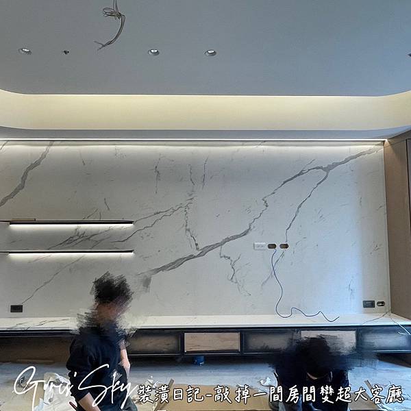 電視牆面的測光感,以及主要的大理石感,基本上客廳就不會有吊燈了,簡約一點會比較舒服。