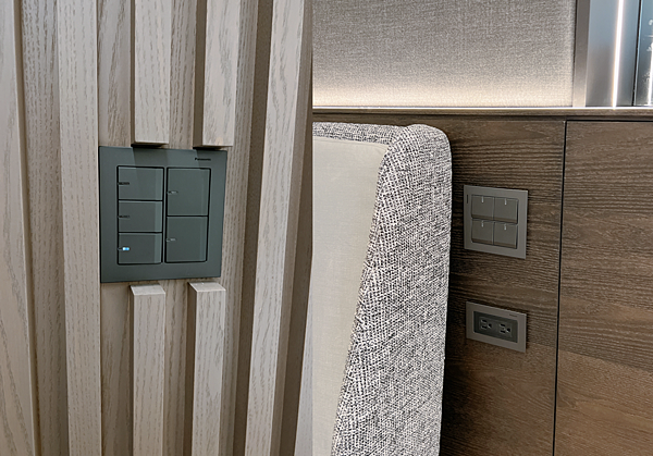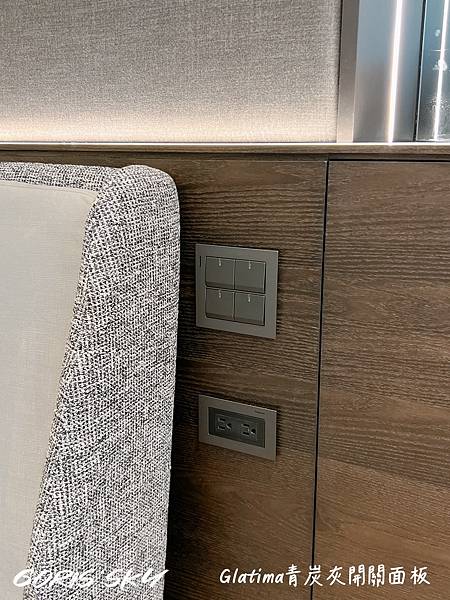 床邊的Glatima青炭灰開關面板設計,很有飯店感。
