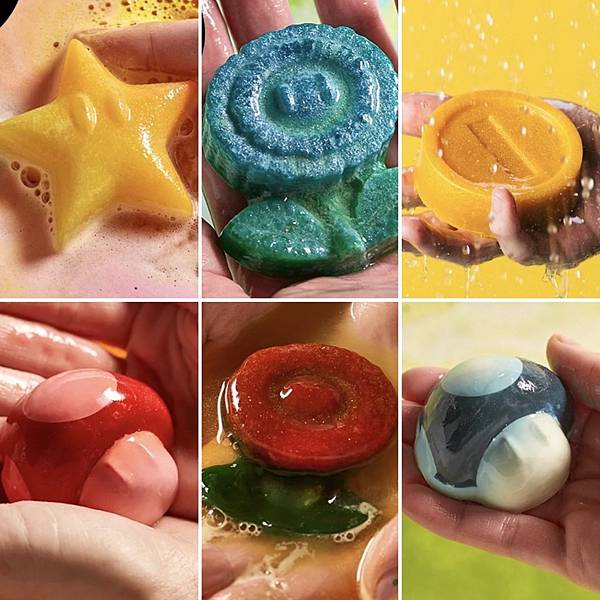 問號方塊汽泡彈融化後總共會有6款香氛皂,都是瑪莉歐裡面的元素,香菇部分有紅色、藍色兩款、花花有紅色、藍色兩款、還有硬幣、無敵星星這樣,6款都不一樣味道。