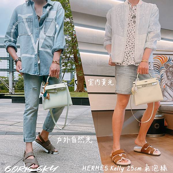 然後對比一下同樣的0S VERT FIZZ氣泡綠,但一個是mini康康淡金扣,另一個是Kelly 25cm銀扣,完全就是不同的感覺,所以雖然一開始也覺得同色會不會有點疲乏,但其實呈現在康和Kelly感覺真的又完全不同風格,加上我的氣泡綠康是淡金扣,Kelly搭的是清爽的銀扣,不同的感覺、不同的舒服,念在我自己很愛氣泡綠,也覺得很可以了!喜歡!