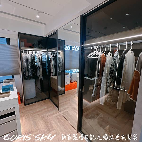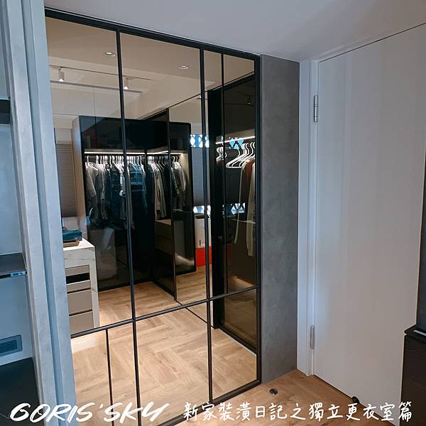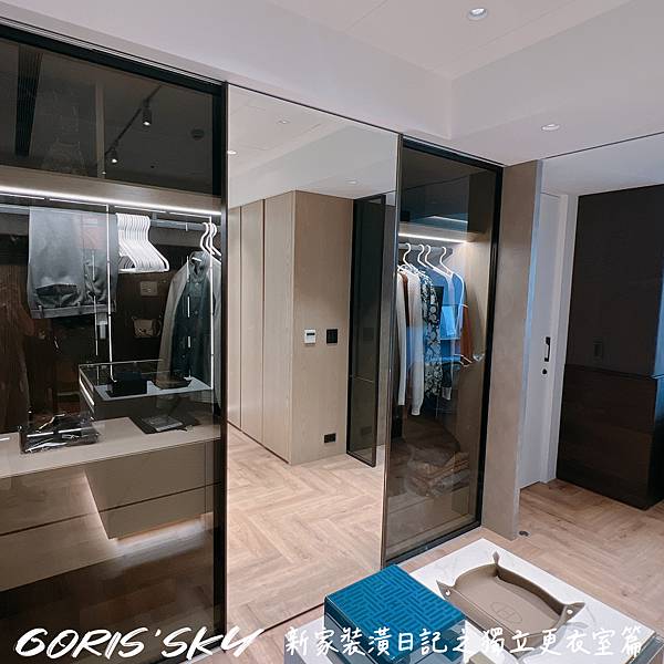 我的設計師,以及有一派的人都認為如果做了獨立更衣室,就不需要做拉門,這樣除濕乾燥才比較方便,我必須承認,我在家的時候,基本上這些拉門我都是打開,看似有些麻煩,但我跟你說,當你想要視覺好看一點的時候,把他們推回去,或者是像我透過灰玻璃去做稍微色彩一致的修飾,真的還是好看、舒服很多,我還是推薦要做,特別是全身鏡的部分,務必提醒設計師幫你稍微擺一點斜,照起來會比較顯瘦!哈哈