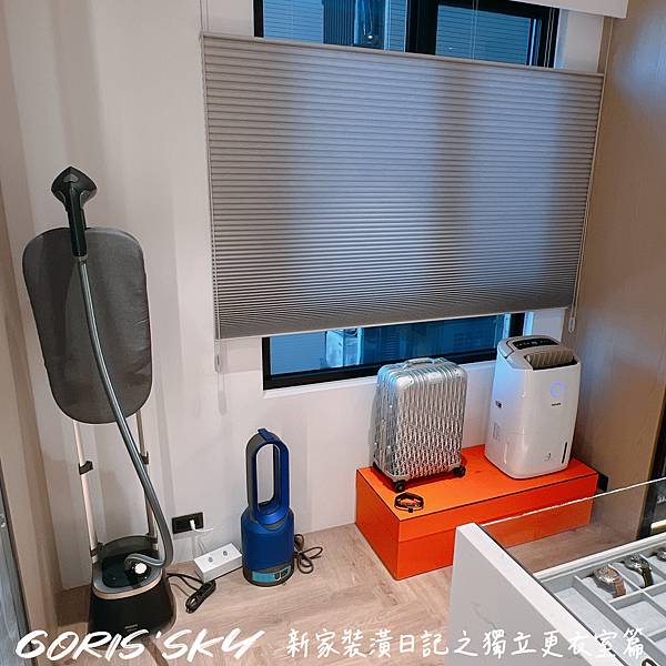 這面一位主要是窗戶,風琴簾下就是單純擺放一下掛掛燙機,登機箱、除濕機等。我有訂一個愛馬仕的椅凳,之後這裡有點想擺,到時收到再看看。