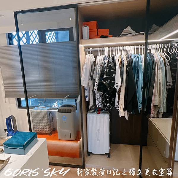 首先,我的獨立更衣室是連動我睡的主臥,所以可以營造出整個主臥非常大間的感覺,但因為不要太浪費除濕還有冷氣空間,兩者間有用一個推門來間隔,而更衣室的部分,我基本上全日都有開空調的除濕,後來飛利浦的除濕機我也放在這裡,我想我的包包衣服應該都可以很沒事的不發霉!哈