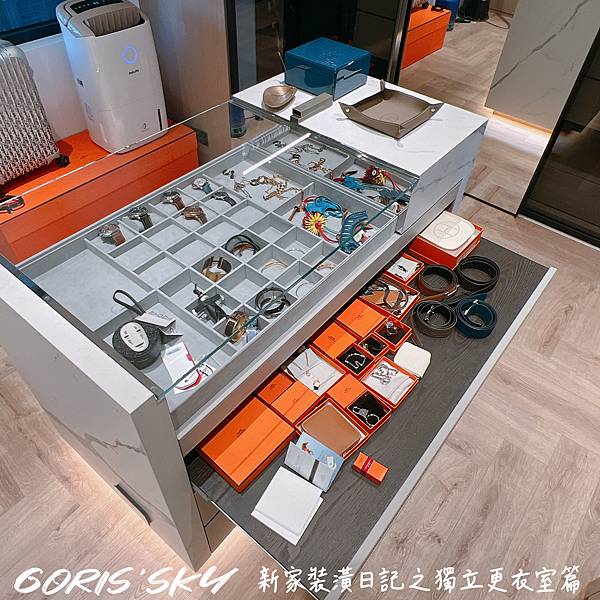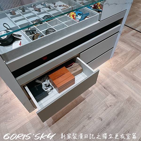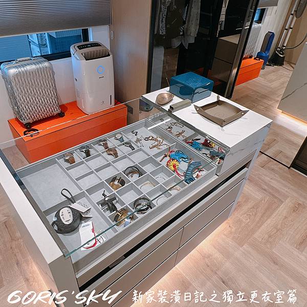 我的獨立更衣室空間不太小,中間有做一個手錶珠寶飾品櫃的中島,然後基本上一面垂直直角做可以展示的衣櫃,另一面比較視覺直接看不到省錢做了系統櫃,然後再一面,當然就都是陳列我的包包(這面之後我在獨立分享)。