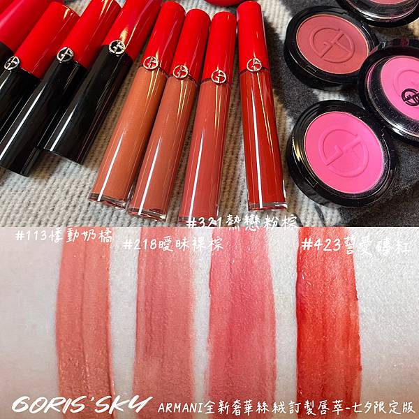 ARMANI唇彩中最強,連林志玲、小S都曾經代言過的紅管奢華絲絨訂製唇萃!!!!一抹霧光顯色、絕不低調2023年迎來重磅更新!!!率先在七夕搶先釋出全新4色作為前導,可以搶先體驗全新質地而且更不黏、更滑順,然後霧光的好美的全新絲絨訂製唇萃 !!!!全新絲絨雲霧感的4款浪漫愛情階段的棕紅色,從曖昧悸動婉如初戀般的113悸動奶橘,到愛意漸漸升溫、加速的218曖昧裸棕,然後再到熱戀溫度的321熱戀粉棕,最後是愛是永恆的423誓愛磚紅。