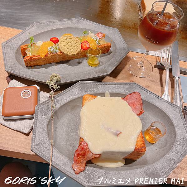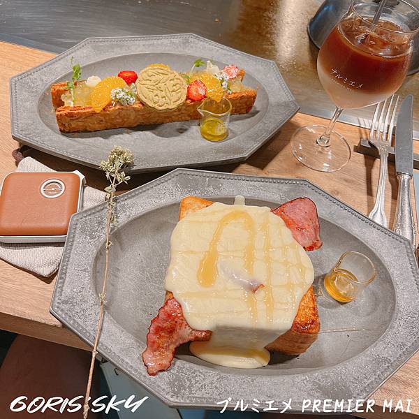 基本上,プルミエメ (PREMIER MAI)是會幫你煎好極厚吐司後,煎好培根,然後要淋上起司會跟你說,讓你可以拍照之類,上上來大概是這樣。