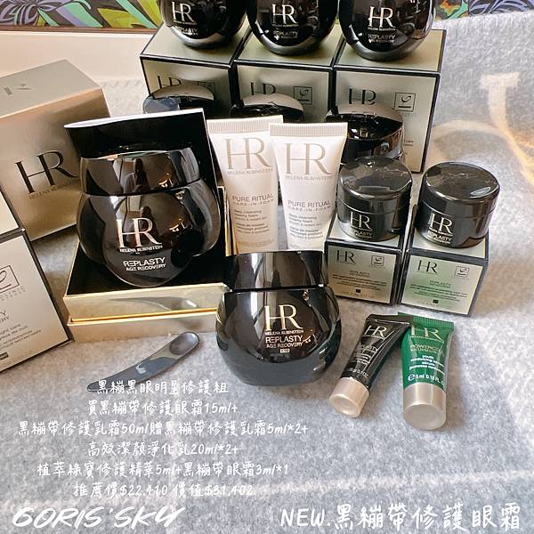 但就像我說的,你謹記,HR赫蓮娜最強就是黑繃帶,黑繃帶開頭的包括修護乳霜、修護眼霜都很可以買,你兩個週年慶一起帶,贈品幾乎兩倍的一次送更多搭配百貨滿千送百、銀行刷卡禮、滿額贈可以說不只臉部、眼周修護都很有感外,就連新品折扣的超級有感!
