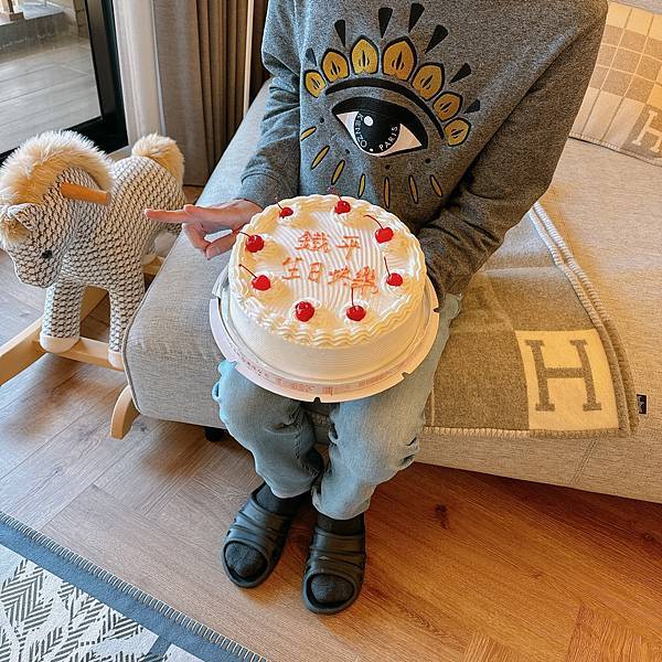 總之,他第一次在台過生日,標誌性的一定要訂一顆紅葉巧克力奶油蛋糕然後寫字給他,因為要寫字就至少要10吋,帶他去拿蛋糕,他又再度被我買一顆大蛋糕嚇到。