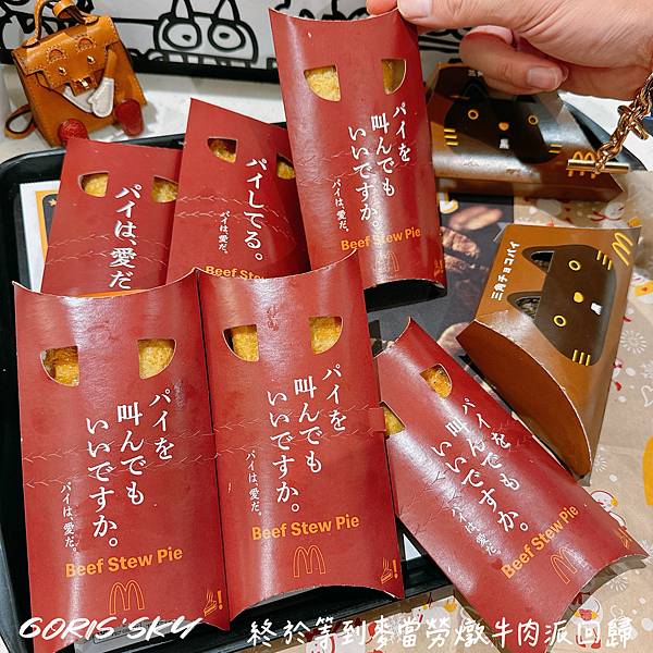 「滾燙的牛肉派,是愛啊」「來一份滾燙的牛肉派不是不錯嗎?」今年回歸更是在包裝上印製了一些日文標語,然後啊,你真的不用太擔心跟店員不會點餐,直接自助點餐,單子拿到等較好就好超方便!只是本來還想再吃一下11月來吃覺得很好吃的白貓草莓卡士達三角派,可惜已經沒有了,但黑貓三角巧克力派還有唷!