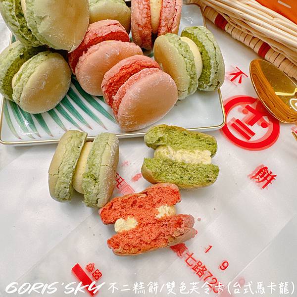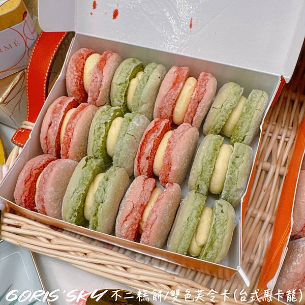 打開來這不二糕餅的芙令卡(台式馬卡龍),你看看這限定版雙色的,看起來你說輸Pierre Herme馬卡龍嗎?哈哈哈哈是啦,當然沒有Pierrer Herme那樣精緻感,但這樣的澎湃感也很不賴吧!