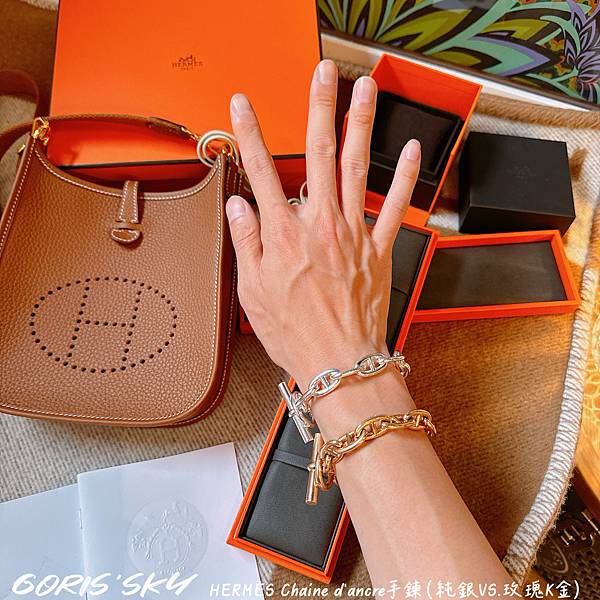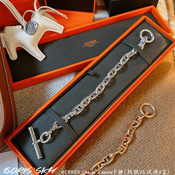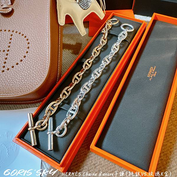 玫瑰K金、純銀的ㄚHERMES豬鼻Chaie d'ancre手鍊一起上手感覺就真的蠻不一樣的,所以兩條都買我個下覺的也不衝突,就更多搭配性這樣。
