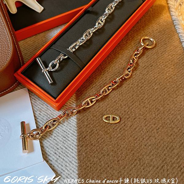 基本上我這兩條HERMES豬鼻Chaie d'ancre手鍊都是一樣款,就差在玫瑰k金、純銀兩種材質,然後玫瑰K金多一環,以及都是T扣設計。