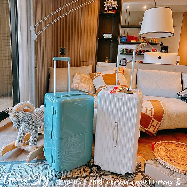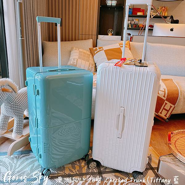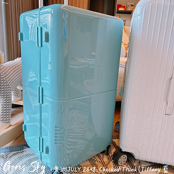 但我真的不想再用RIMOWA的鋁鎂合金,一來貴、二來重、三來容量真的很有限,我就很想一個中間值、好裝的,然後先是被JULY這Tiffany藍的顏色給打到,也太太好看了吧!而且設計上也是我現在很愛的胖胖箱設計,然後他的材質明顯就比RIMOWA的厚、硬一點,但整體重了500g尚可接受,然後28吋確實比我本來的RIMOWA Trunk Plus小一點點但我覺得還ok,因為你真的拖過RIMOWA冰箱出國去日本,置物櫃、房間都會因為有點太大而覺得有些不方便。