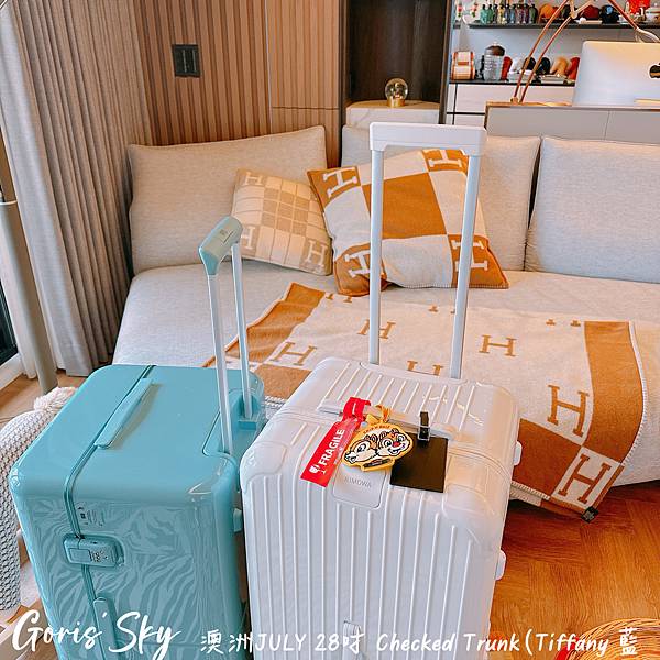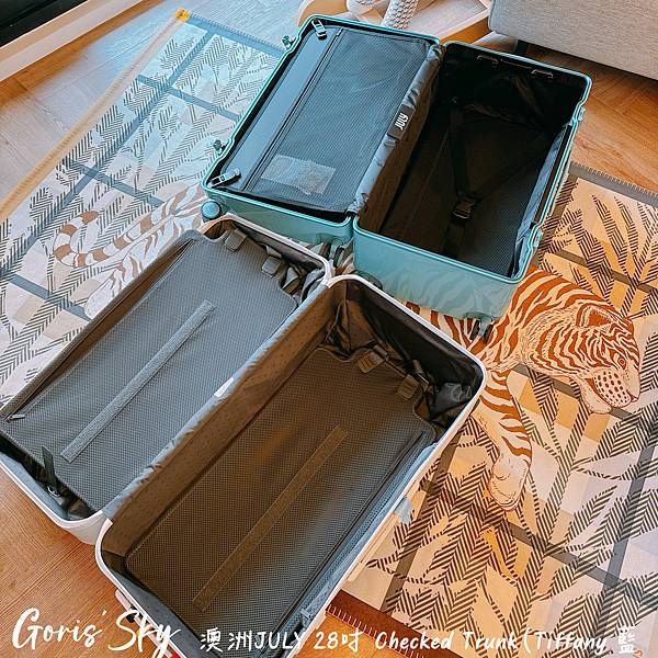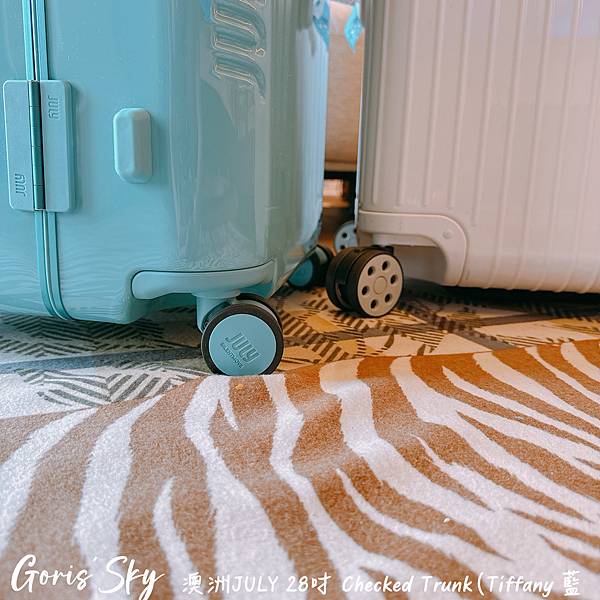 我本來是打算我下次飛再來開箱!但因為我好像短時間也沒有出國的計畫,只有一次剛好拖去外面工作就覺得很滿意的就乾脆先拉發一下!就這Tiffany藍盒子般的澳洲July Checked Trunk聚碳酸酯胖胖箱行李箱!!!!!我只能說,機能上、保護力上都比RIWOWA好過一倍!但價格一半不到左右我覺得太值得了!但缺點先寫在前面實際測試容量上也真的沒有RIMOWA的拉鍊款TRUNK PLUS好裝,但整體來說可以說設計更友善更方便!