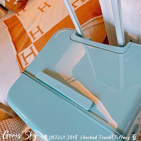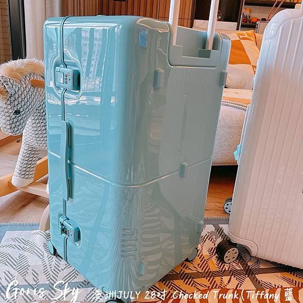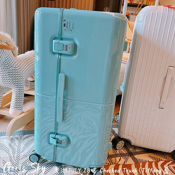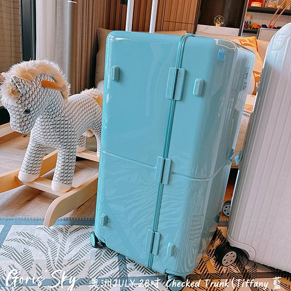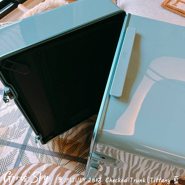 因為澳洲July Checked Trunk聚碳酸酯胖胖箱行李箱不是拉鍊是鋁框,跟著行李顏色的Tiffany藍金屬色真的也是好美好好看
