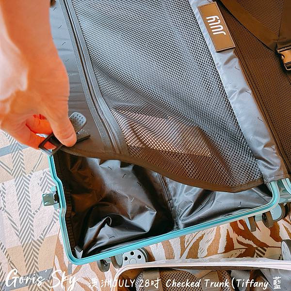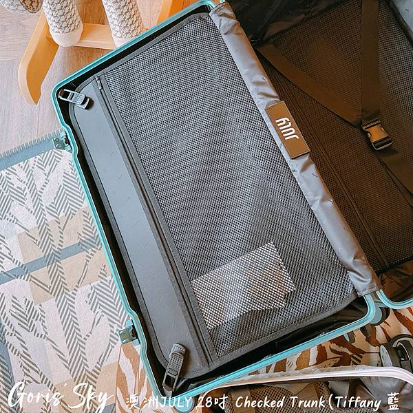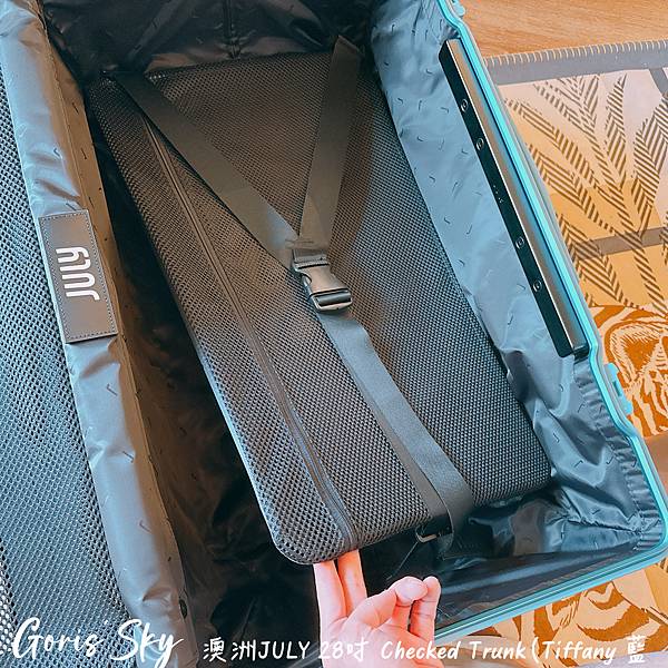然後JULY這行李箱細節、質感真的處理很好,這款不是拉鍊款,拉鍊的話要考慮CHECKED PLUS,這款是鋁框的,跟著行李箱顏色的TIFFANY金屬藍好好看,各種開關也都是TIFFANY藍,打開來的分層設計我真的餓是太洗歡,除了一邊讓你放大量主要行李,另一邊透過扣式的方式做分層真的質感太好也好方便,整個滑起來也還嗎順很安靜,用起來很滿意!