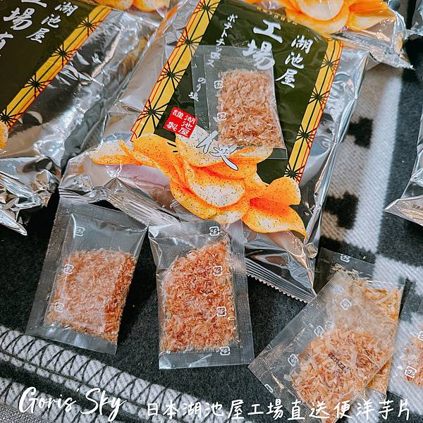 湖池屋「工場直送便」很特別的就是每一包有附鹿耳島的柴魚粉,貼在包裝外面這樣