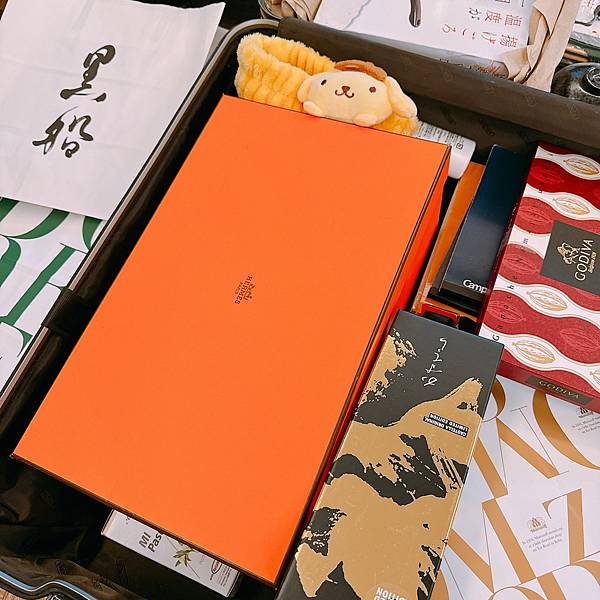 我託他幫我帶的愛馬仕,只有其中一個,其他我先抽起來哈哈,他之前在用的,我在台灣買給他的布丁狗髮帶他還帶來我也是問號