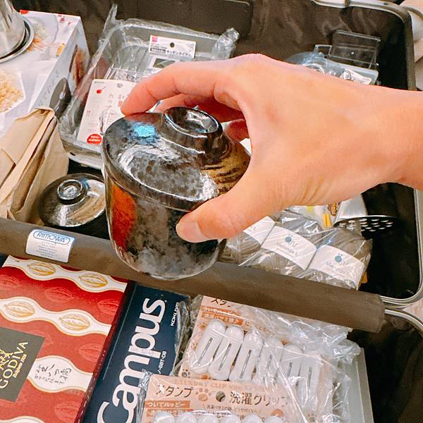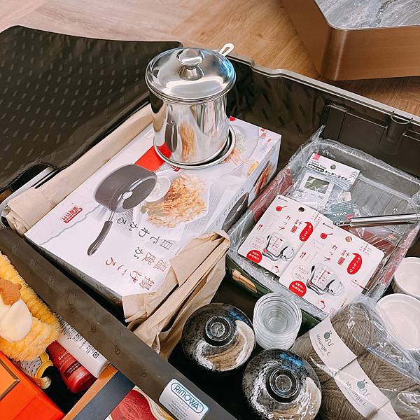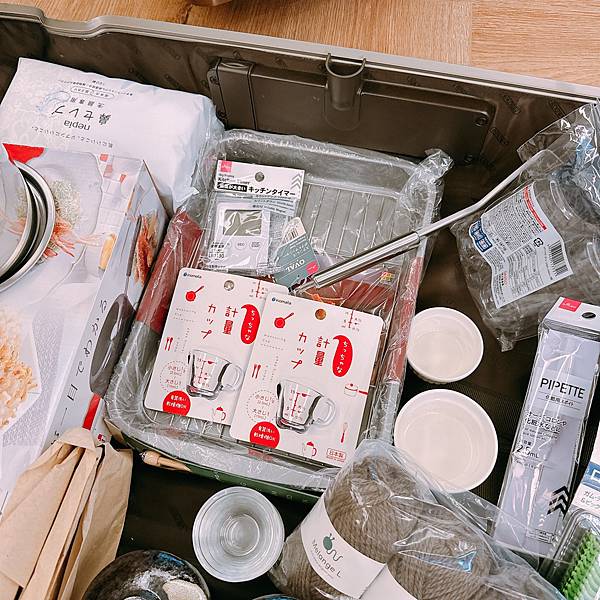 各種料理用的量杯、小碟、醬料碟、茶碗蒸的窯燒碗、喝味噌湯的碗、油炸小鍋、計時器、油炸碟、做便當的器材、還有一個有溫度的鍋子等....好好笑好荒謬,他是要來我家每天煮飯給我吃嗎?但我比較想吃外面哈哈哈哈哈,他還一一跟我說一堆幾乎只要100日圓、150日圓之類很便宜!