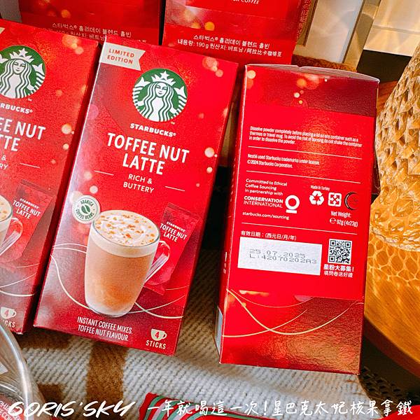 而星巴克太妃核果拿鐵就是每年的年末限定,而且就是限量的!今年新的幫你們看了期限,確認是到2025/7/25,所以你11月開始買,大概會有8個月可以喝左右,一盒4包,可以大概去算一下要囤多少包,不然賣完就沒了也喝不到,錯過又要等明年年底才會有,而去年你有買,忘了喝、捨不得喝,沒喝完的,請注意!絕對絕對過期了!不要喝了,快丟掉,怕你們喝壞肚子,這星巴克太妃核果拿鐵說真的也不是太貴,下次記得要喝完,喝不完真的丟掉吧,一盒也就129元,你喝壞肚子,掛號費200反而更貴真的得不償失,但要珍惜食物,下次記得喝完唷!