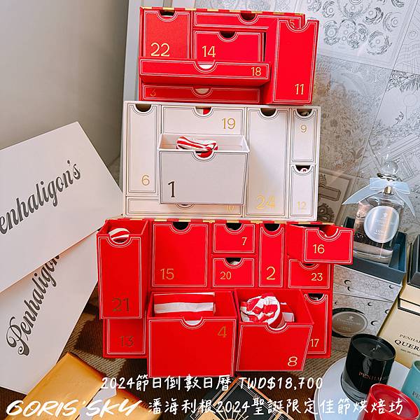是聖誕倒數日曆!來了來了!!!!年度壓軸最重點的潘海利根聖誕7組全內容價目搶先看!!!!!!小香水香蠟燭甚至是最明星最熱賣的LUNA月亮女神隨身攜帶嚐鮮超方便的30ml香水年度最後收藏就是這一次啦!!!!用膩大眾香的看過來,同樣來自英國倫敦,質感更好、更不撞香,同時更有但佳節氣氛的潘海利根聖誕限定就這次!趁百貨週年慶滿千送百折下來絕對最划算!!!!!!