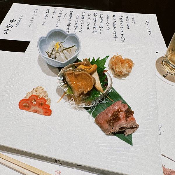 集合各種海鮮、牛肉的拼盤,這也好吃,鮑魚、鯛魚、牛肉、干貝等都吃得到了