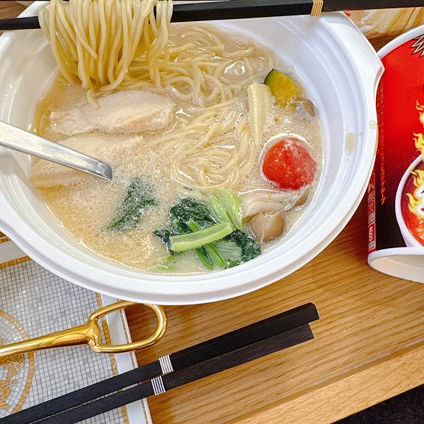 實際拆解製成看起來有模有樣,底部也是明顯的高湯凝固,上面搭配的雞胸肉、番茄、玉米筍、南瓜、甚至是青菜等,微波加熱5分鐘可以吃真的很方便,平心而論,麵體還是Q的可以,雞胸肉還是嫩的可以,青菜我是看不懂很不搭,番茄、南瓜是還原我可以理解但很燙要注意,但最大問題是雞白湯湯頭!可以理解好現在台北中山區那間銀座篝KAGARI拉麵也是日本空運過來的湯頭解凍還原,照理說應該一樣?但吃起來真的完全不一樣的單純一種死鹹感,雞白湯的濃潤香氣完全沒有店裡吃的感覺,雖然說超商這樣微波拉麵要完全跟店裡一樣本來就不太可能,但作為名氣這麼大的米其林一星的銀座篝KAGARI拉麵,這樣的表現真的讓人覺得可惜也真心失望。