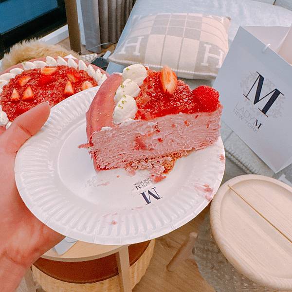 LADY M日本沒有,我媽也愛吃,他來台會一直吃,我媽生日也愛吃,我個人覺得LADY M就千層好吃,其他純蛋糕的那種我覺得還好,有新口味都想吃吃看,這次聖誕有新的口味草莓起司千層蛋糕,整個千層蛋糕都變成草莓色,上面還有一層的草莓跟草莓醬,想說應該怎樣都絕對好吃的,但可能因為有起司的關係,吃起來鹹甜鹹甜的我有點不是很習慣,感覺LADY M真的還是要純甜的千層蛋糕最好吃!