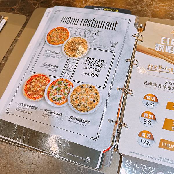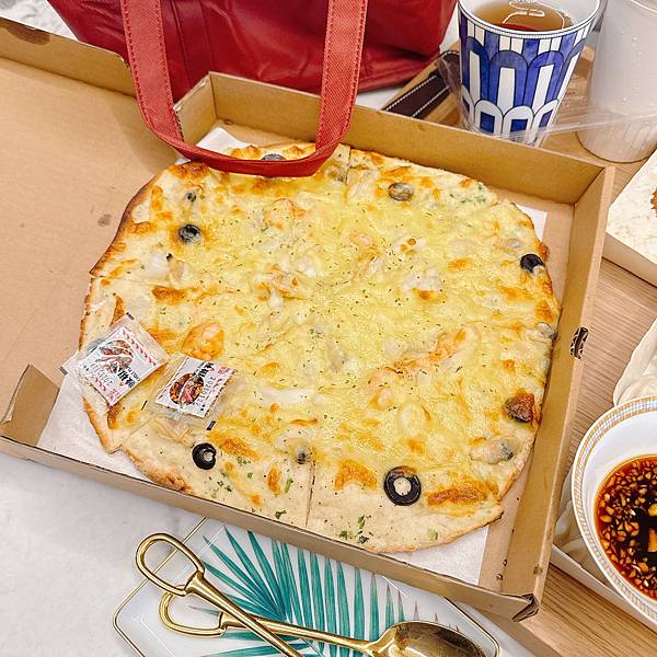 然後意外很好吃是這馬賽海鮮披薩,9吋399,這個很好吃!我也是看人推薦的,薄脆的,起司很多,海鮮也不錯,不建議加辣椒,不太搭,這個很好吃,可以一起帶!