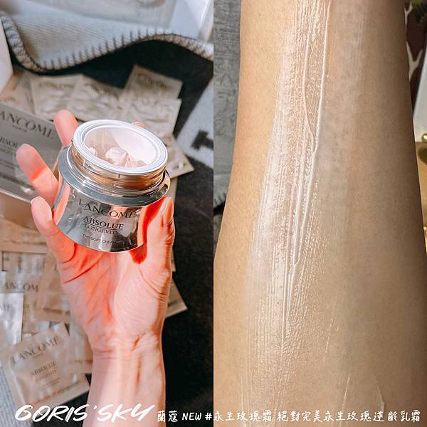 就如我剛剛提到的,全新的永生玫瑰霜可以說質地完全的更進化,打破你對頂級乳霜總是厚重、需要時間乳化、黏膩的刻板印象,這是一瓶,只要你覺得你想要開始抗老了,任何年齡都可以馬上開始使用的入門款頂級乳霜,使用時不需乳化,質地一抹瞬化,有著抗老乳霜該有的潤度,但整體輕盈非常好吸收,擦起來也不會完全無感,非常潤澤有感,就像是馬上給肌膚注入修護能量。雖然醫美很流行麗珠蘭,但我自己是覺得很可怕、感覺很痛啦,我自己沒追求到那麼極致,保養能做到的話我覺得好好擦保養勤勞就很夠了,這永生玫瑰霜就是給你注入滿滿蘭蔻這次升級關鍵的醫美級PDRN,無痛,但又能澎潤、緊緻彈力的很有感。