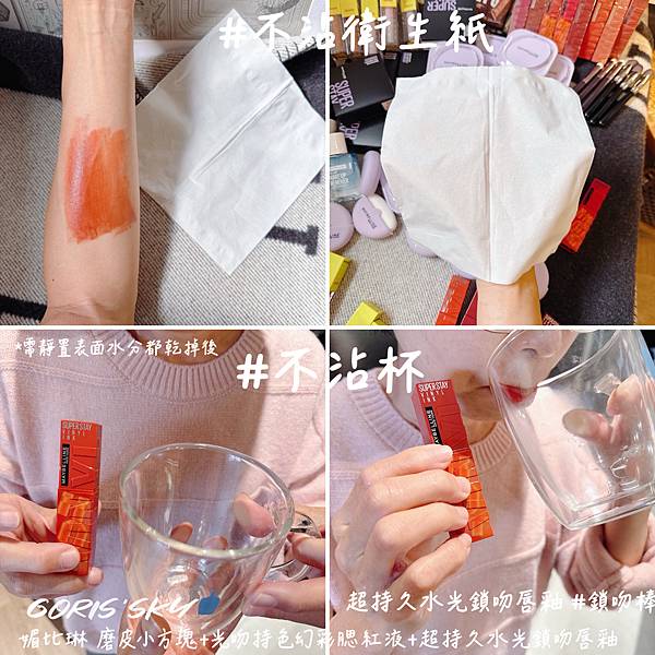 以及,有實驗有真相,這款媚比琳 超持久水光鎖吻唇釉 #鎖吻棒,你只要上完靜置到表面水分都完全乾掉後(你可以用衛生紙稍微抿乾),抿乾後M,無論是白色的衛生紙,又或者是透明杯子、都完全不會暈染沾色沾杯的很持妝,惟卸妝時要稍微用心一點,但我試過卸妝油好好按摩還是很好溶解的!
