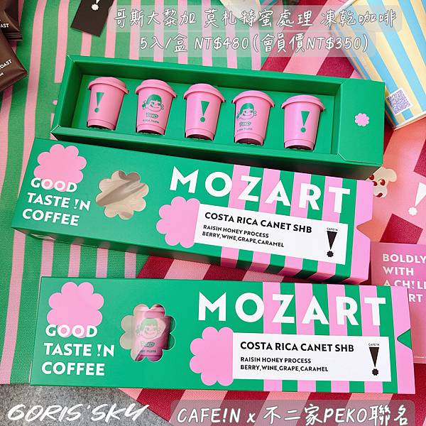 全新推出的「哥斯大黎加 莫札特蜜處理 凍乾咖啡」,以搶眼可愛杯身造型登場。使用葡萄乾蜜處理屬雙重發酵技術,帶出似白葡萄酒的清爽酸甜著名,-40度環境下,48小時真空冷凍乾燥處理,能無損香氣並完整保留咖啡原始風味,1:1還原現磨手沖咖啡,不用機器加水直接沖泡,隨時隨地都能輕鬆喝上高品質精緻咖啡。