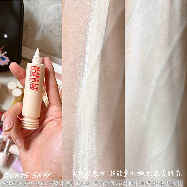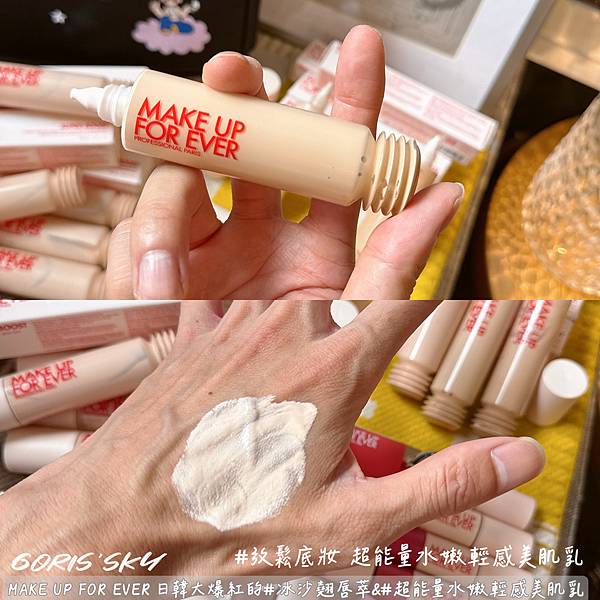 MAKE UP FOR EVER 超能量水嫩輕感美肌乳質地蠻特別,擠出來有點慕斯般的水乳感,這樣的質地有點意思,就我自己的美妝經驗,基本上針對毛孔、凹洞有一定補土效果。