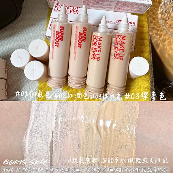 有別於市面上的粉底液需要依照膚色挑選色號,MAKE UP FOR EVER 超能量水嫩輕感美肌乳強調以『氛圍』選擇妝容,因為不是過分遮瑕修飾,而是看你想要呈現什麼樣的偽素顏狀態,仙氣感、紅潤感、裸米色、裸麥色等,但最重要都不失在肌膚紋理、毛孔、凹洞的修飾。