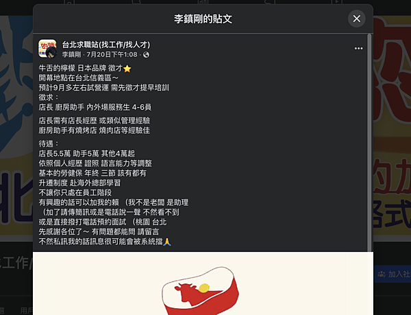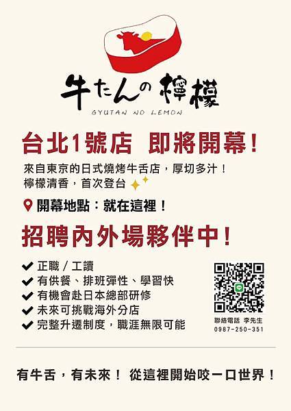 吃過嗎?有徵才資訊截圖為證!不用飛日本台灣也要吃的到啦!這兩年有飛日本無論東京大阪可以說幾乎一堆人都吃過的超人氣厚切的牛舌檸檬全球第一家店就在台灣,就在台北,就在市政府站附近的逸仙路街邊專門店,預計最快9月開幕啦!