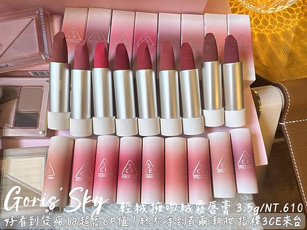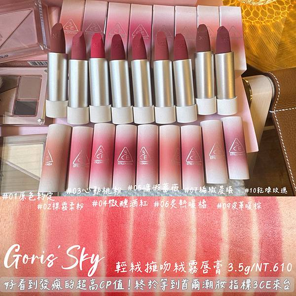 唇膏!!!!真的拜託一下!定價610元的輕絨擁吻絨霧唇膏就很好用也很好看了!還有打折!!!設計真的細節滿滿,唇膏上也烙有3CE,色號不同,外殼漸層設計也不同,那個質地真的會感動的羊絨般的絲柔感,誰擦誰溫柔的薄擦輕輕暈染自然好看,厚擦飽和顯色的霧感奢華!可以說乾燥玫瑰色的始祖10清冷又神秘;01編織晨曦顯白的暖棕低調靜奢;09皮革暖棕則是高級沉穩裸棕感!
