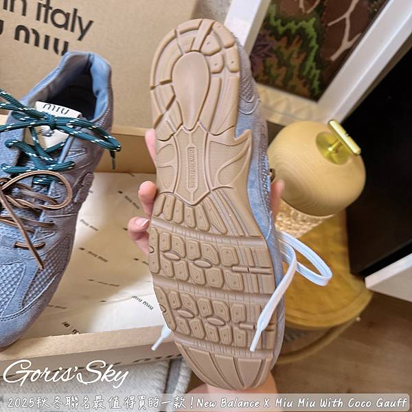 不過,miu miu的鞋我真的就單純只穿只買NewBalance聯名款,就覺得好看、旋頭很精緻、實穿、好走、也不會痛,雙鞋帶也好看,總之,很推啦,不然真的不會新色一直想要再買,這常長春花藍真心好好看我也真的沒有這種顏色的鞋,推推!質感真的有夠好!