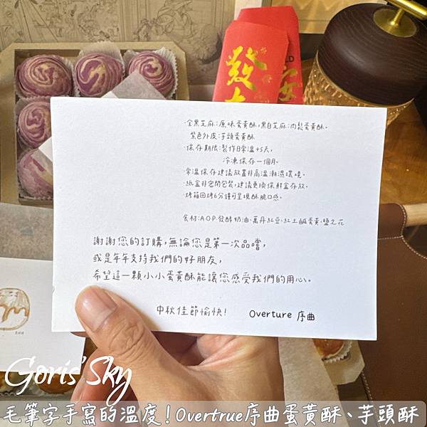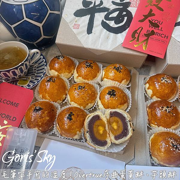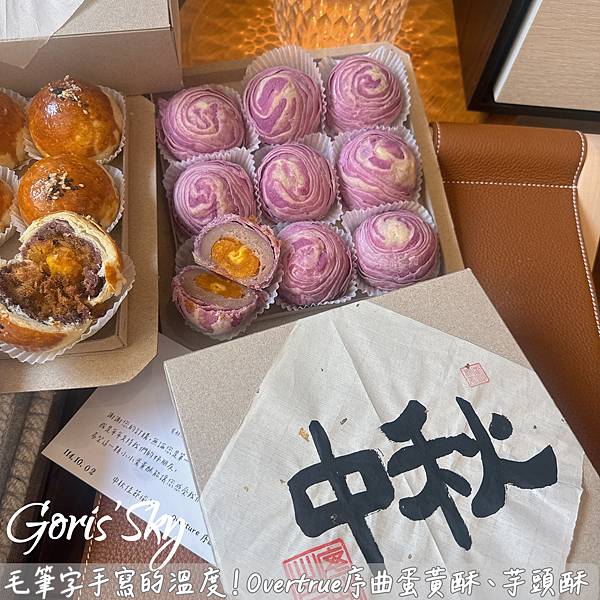除了整顆水蜜桃馬卡龍外!選在中秋今天最壓軸發的就是去年吃過一次,被其文青手寫毛筆字的溫度,同時強調環保愛地球都是善待自然全包裝可回收材質,但又可以這麼有溫度,質感這麼好的Overtrue序曲今年不只有最經典艾許奶油蛋黃酥以及肉鬆蛋黃酥外,更加碼推出了我最愛的甜芋頭的芋頭蛋黃酥!!!!!!