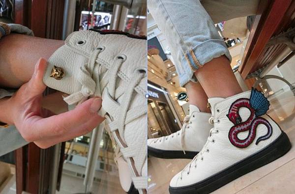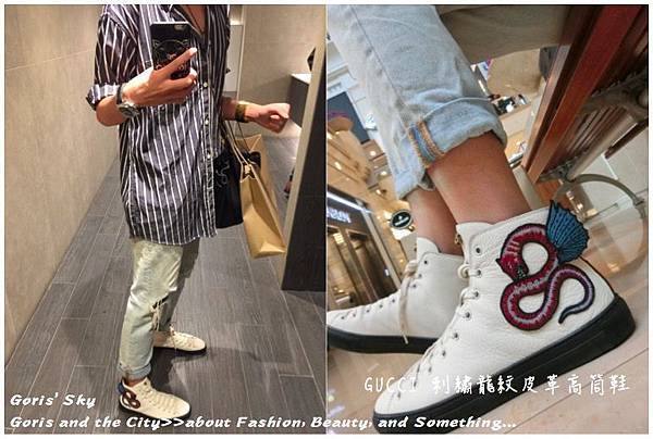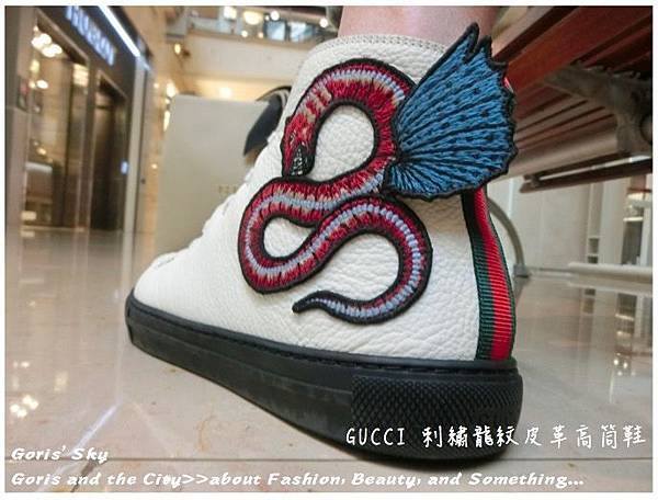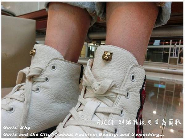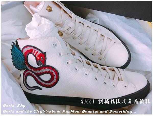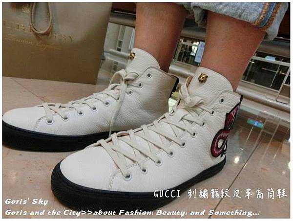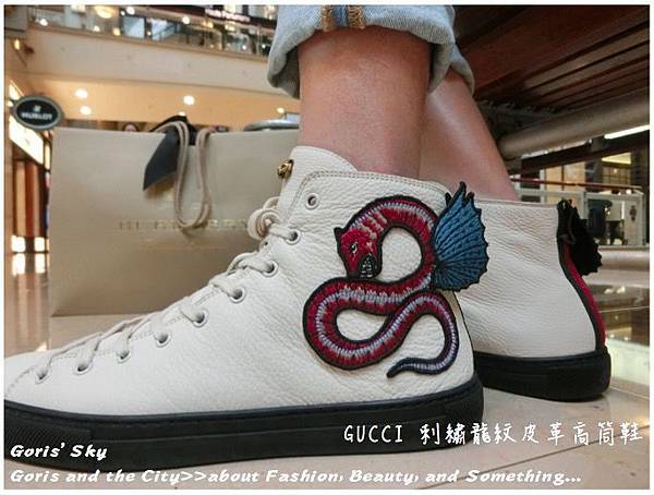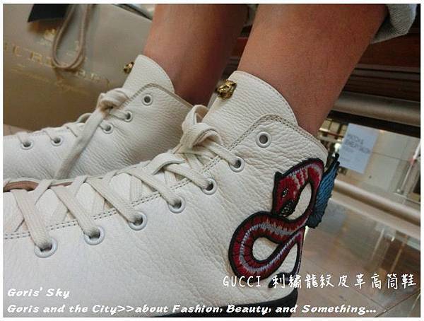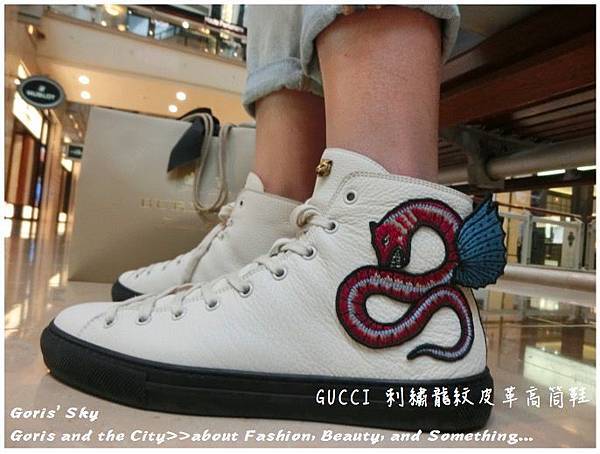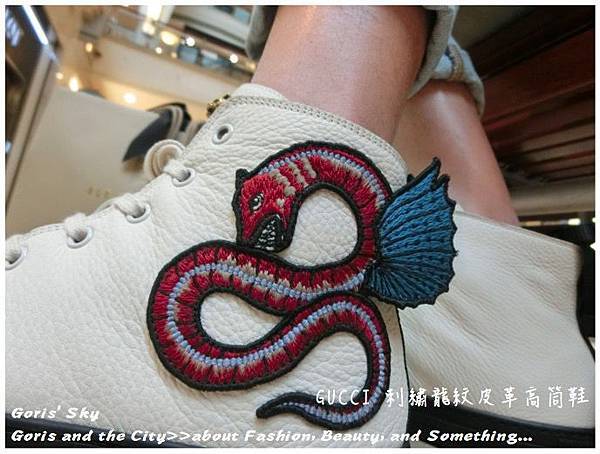 今年到現在在GUCCI買了幾雙鞋,除了有一雙我自己買了都很滿意的涼鞋外 滿5000折500!GUCCI金屬不對稱防水涼鞋(Rubber buckle strap sandal)實穿 ,另一雙買的也覺得蠻開心的就是這雙刺繡龍紋皮革高筒鞋,其實我這上半年就買了,但我很好笑的是,買了就一直放在鞋櫃裡,都沒有穿,當時會買,真的單純就是覺得很美,然後有活動就一起買了,買回來後,又看在他是淺色有點捨不得穿,加上時令夏天,我覺得也比較熱,不太想穿高筒,就這樣一直擺著擺著擺到最近才拿出來穿,都有一種快過季的感覺了。
