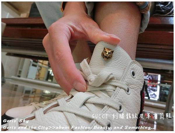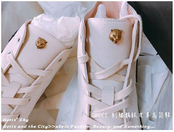 而且我捨不得穿到,都有點動了想要賣掉的念頭,但後來我朋友勸我不要賣ㄝ說這雙真的很好看,留著穿,不要捨不得穿,就算是全新,鞋有分size也不好賣,加上GUCCI現在轉手行情價也幾乎只有5折,太划不來,所以後來我還是乾脆自己拆開來自己穿了。是說,這雙GUCCI 刺繡龍紋皮革高筒鞋,當時讓我很心動,然後購買的關鍵之一,就是這裡都還有立體的金雕虎頭,相當好看!