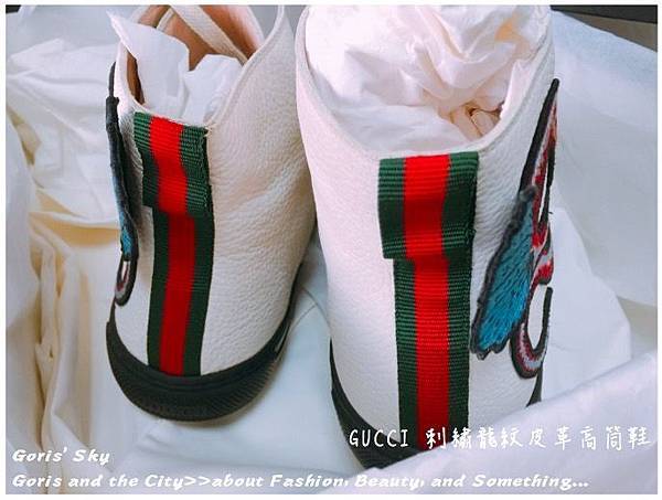 然後,必須說,這GUCCI 刺繡龍紋皮革高筒鞋整雙鞋,可以說是完全沒有任何的GUCCI LOGO或是直接能清楚識別的GUCCI樣式,惟鞋的後方有著精底的紅綠織帶點綴,懂的人大概一眼就看得出來,而且這樣的紅綠織帶,在一整片的白色皮革中,輕輕的點綴,倒也是更增添許多有趣、可愛、好看,不過,我是覺得就算沒有這紅綠織帶,單是看這樣的鞋型,刺繡、龍、老虎、蜜蜂之類 ...,也不難想像是GUCCI的設計,這也是現在GUCCI最具識別度的品牌概念,卻不是透過LOGO來告訴你:我是GUCCI(雖然GUCCI LOGO T 也是莫名賣得有夠好)。