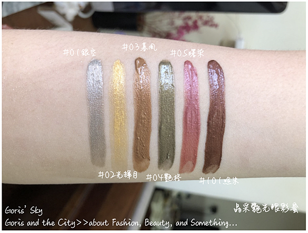 一共6色,其中#101照朱為限定色,包括純粹銀箔般的#01銀空,對照#01的金緻明亮的#02光輝月,溫柔暖可可的#03暮風色彩,帶橄欖綠色調的#04艷柊(這字音同中,因為DAI大無限樂團有一首歌就叫"柊",相當好聽,所以自此讓我認識這一個字,但我猜現在應該沒人知道大無限了吧...),玫瑰晶色調的#05曙染,同時唯一限定色帶有點一點紅銅色調的#101照朱(限定色)。