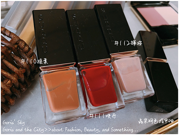 最後的晶采妍色指甲油,更宛如是一種各種秋天、秋意落在指尖的色彩,從宛如剛枯黃的落葉#110搖葉,然後到轉往楓紅的#111咲丹,以及那似乎光芒輝映卻又透出晨曦粉嫩的#112輝櫻,一一形成各種切日的寫意,優雅同時有些的浪漫。