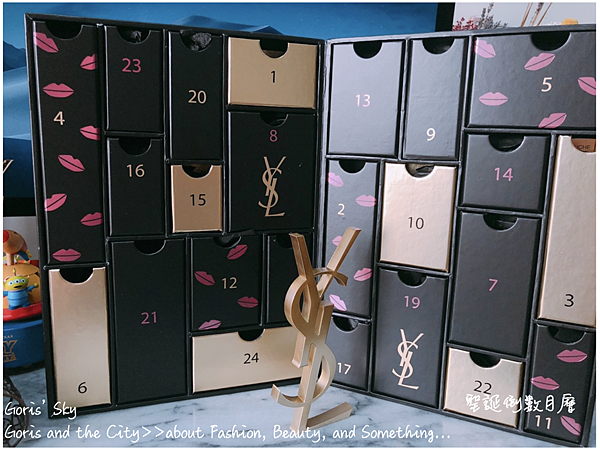 回到重頭戲,也就是這一次YSL首度推出的聖誕倒數日曆,其全名是金燦情迷聖誕倒數月曆,主要也是follow這一次YSL的聖誕彩妝的系列名稱,其在包裝設計,也同樣的將整個YSL Cassandre Logo給一整個放大、最大然後作為整個包裝的主要封面,其金蔥對比極致黑底,更襯出宛如黑夜中的YSL花火般的盛放、同時美麗,旁邊還伴有一個小嘴唇的可愛設計。