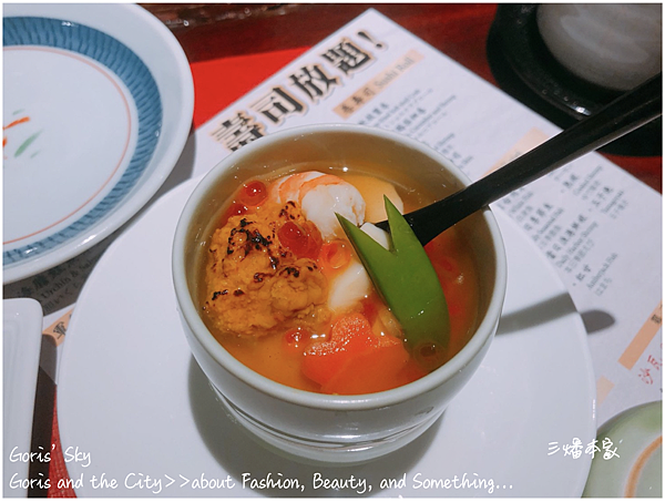 首先,前菜會先上的就是海膽鮭魚卵蒸蛋,這算蠻有誠意的蒸蛋,該有的海膽、鮮蝦、鮭魚卵都沒少,搭配著蒸蛋,熱熱的香香的也好吃,這吃完同樣想吃也可以再續!