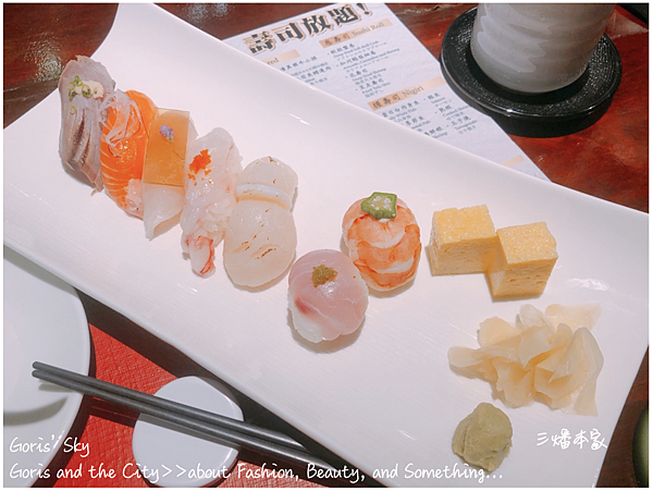 不過,我一開始就想說既然都要來吃這一頓1680的頂級壽司吃到飽,我還在想說我坐下來就要狂點海膽、干貝之類...,結果服務員說會先上一份基本盤,約莫20貫的壽司這樣,於基本盤結束後,才能開始自由點餐想要追加的。
