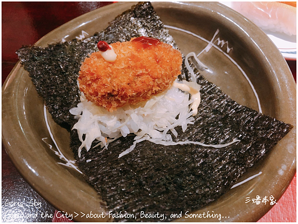 然後這是酥炸生蠔海苔捲,其實我也是沒那麼敢吃生蠔,但稍微炸過,有油炸外衣我就比較ok點,真的咬下去很噴汁,還燙燙的這樣,搭配底下的生菜,也讓整個手捲能跟炸生蠔取得一個剛好的平衡。
