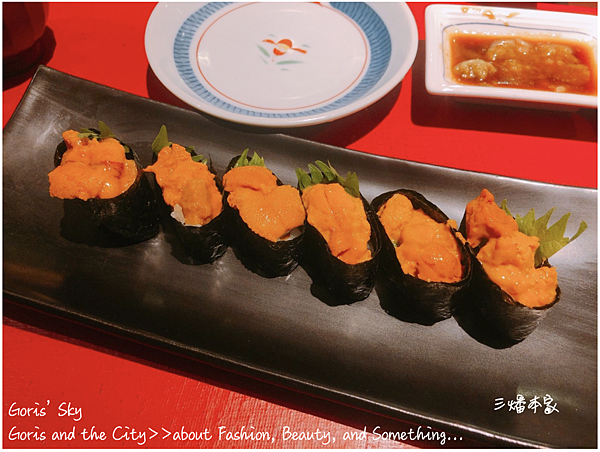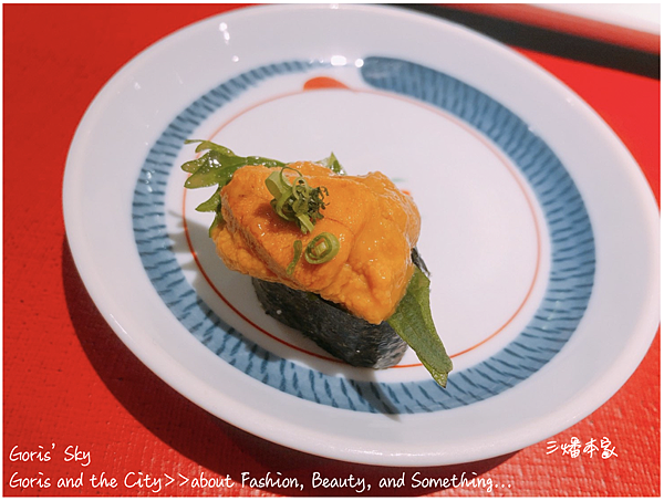 在基本盤中,也會有海膽軍艦壽司,其整個爆滿的海膽,搭配著紫蘇葉,吃起來也很清新,同時一種很幸福的味覺感受。